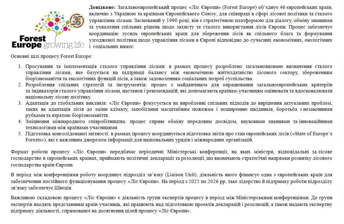 На засіданні групи експертів також розглядалася комунікаційна стратегія процесу «Ліс Європи», яка спрямована на взаємодію з різними зацікавленими сторонами для підтримки та просування сталого лісоуправління в Європі. Така взаємодія буде реалізовуватися шляхом видання періодичного інформаційного бюлетеня «Ліс Європи», проведення семінарів, вебінарів і конференцій, регулярних публікацій у засобах масової інформації та соціальних мережах, підтримання веб-сторінки та проведення різноманітних публічних заходів, зокрема — офіційного оприлюднення звіту «Стан лісів Європи 2025», запланованого на 9 грудня 2025 року.