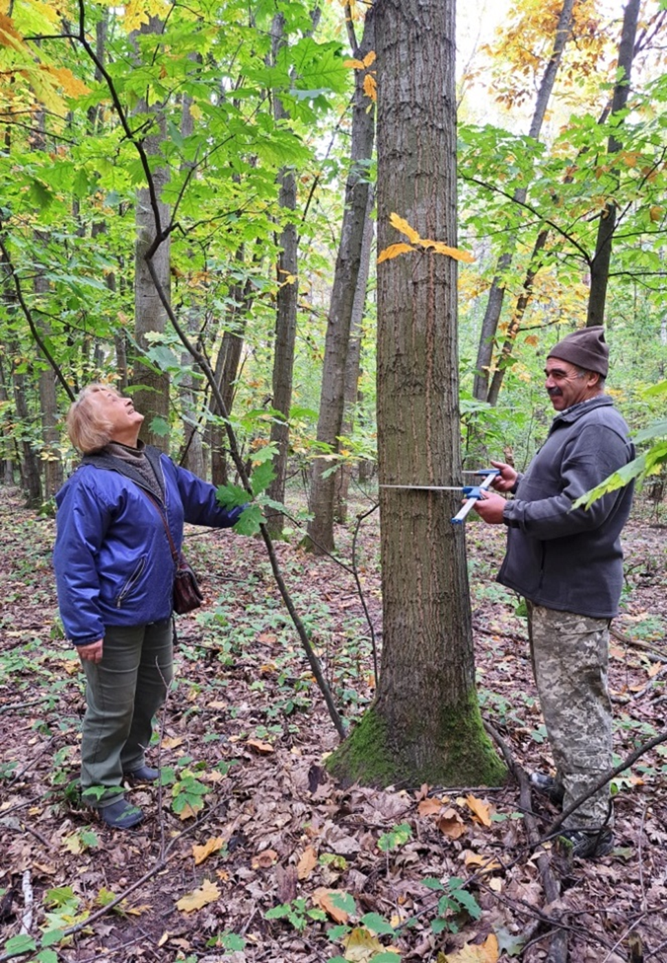 Співробітники ДП «Клавдієвська ЛНДС» В. В. Митроченко та В. П. Базильчук проводять обміри одного з кращих дерев дуба червоного у насадженні 57-річного віку в Першотравневому лісництві