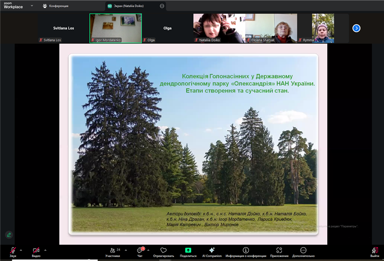 Наталія Дойко доповіла на тему «Колекція голонасінних у Державному дендрологічному парку «Олександрія» НАН України. Етапи створення та сучасний стан», в якій відмітила, що понад 230 років парк, площа якого становить більше 400 га, зберігає свою початкову структуру. Видовий склад дерев, кущів і трав'янистих багаторічників включає 2240 таксонів, а деякі хвойні екземпляри з колекції мають вік понад 200 років.