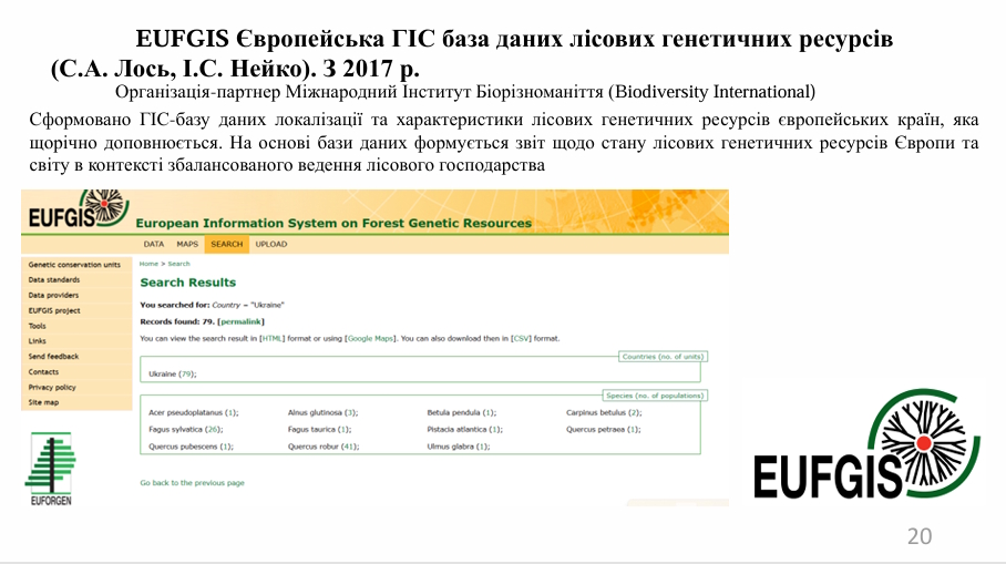 У Європейській ГІС-базі даних лісових генетичних ресурсів (EUFGIS) представлено відповідні дані від України (С. А. Лось, І. С. Нейко). У проєктах «Захист європейських міських дерев та лісів шляхом покращення біобезпеки» (COST Action UB3Guard) та «Збереження лісового біорізноманіття в умовах вторгнення чужорідних видів» провідною організацією є Шведський університет аграрних наук (К. В. Давиденко). У проєкті «Посилення спроможності моніторингу лісів України відповідно до вимог ЄС» бере участь відділ інвентаризації лісів, моніторингу, сертифікації та лісовпорядкування. У проєкті «Стале постачання сировини для лісової енергетики в Україні» (разом із Інститутом природних ресурсів Фінляндії, фінським лісовим центром, Держлісагентством і ВО «Укрдержліспроект») беруть участь представники різних наукових підрозділів УкрНДІЛГА.