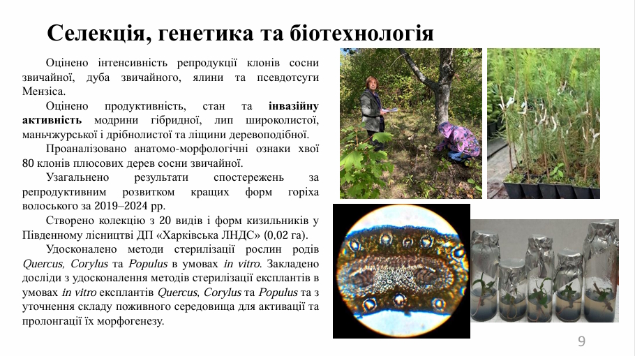 Згідно з вищенаведеним було поглиблено дослідження за основними напрямами. Так, науковцями Східного відділення ЛАН України досліджено вплив різних видів і способів рубок на лісівничо-таксаційні показники, стан, товарно-сортиментну структуру насаджень і на процеси природного відновлення лісових видів. Проведено аналіз баз даних ландшафтних пожеж в Україні за 2024 і 2025 рр., зокрема особливостей формування комплексів горючих матеріалів. Дендрохронологічними методами проаналізовано реакцію деревних видів на зміну клімату та дію інших чинників у лісових і міських насадженнях. Оцінено інтенсивність репродукції клонів сосни звичайної, дуба звичайного, ялини європейської, псевдотсуги Мензіса; стан та інвазійну активність модрини гібридної, лип широколистої, маньчжурської й дрібнолистої та ліщини деревоподібної. Оцінено стан лісових культур дуба звичайного, сосни звичайної, модрини європейської, псевдотсуги Мензіса (дугласії) та ялиці білої, створених сіянцями із закритою кореневою системою. Розроблено рекомендації щодо створення та подальшого формування стійких і продуктивних лісів.