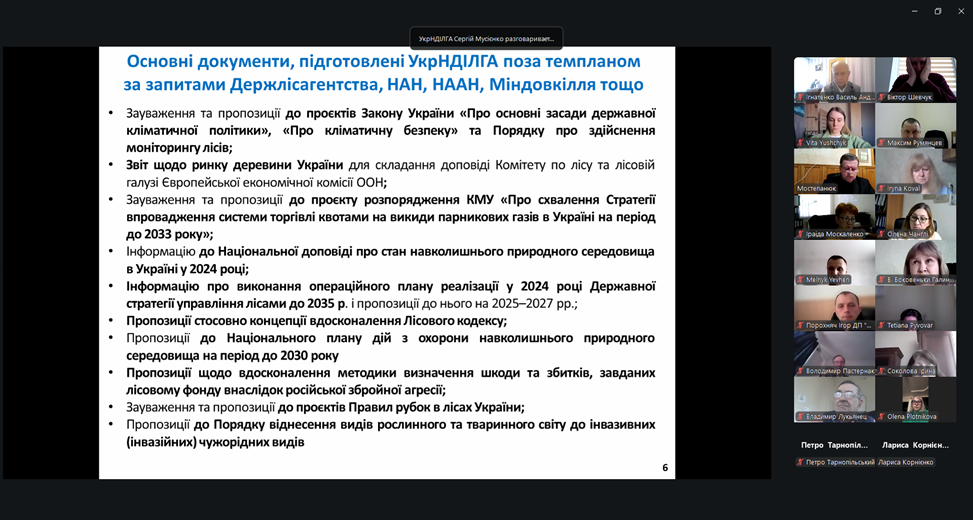 Доповідь першого заступника директора Сергія Мусієнка включала підсумки наукової діяльності установи за 2025 рік. Він відзначив, що в звітному періоді увага науковців була зосереджена на проведенні системних наукових досліджень за напрямами лісівництва та лісознавства, сталого управління лісовими ресурсами, лісовідновлення та лісорозведення, моніторингу лісів і підвищення їхньої стійкості до екологічних загроз тощо. Впродовж року було розроблено близько 30 документів за основною тематикою та поза темпланом. Також співробітниками Інституту й науково-дослідної мережі було надано науково-консультаційні послуги за понад 150 договорами, підготовлено 270 наукових праць, серед понад 80 статей, в т. ч. у виданнях, які включені до бази даних Scopus та Web of Science; вийшли з друку чергові, 146 і 147-й, випуски фахового збірника «Лісівництво і агролісомеліорація».