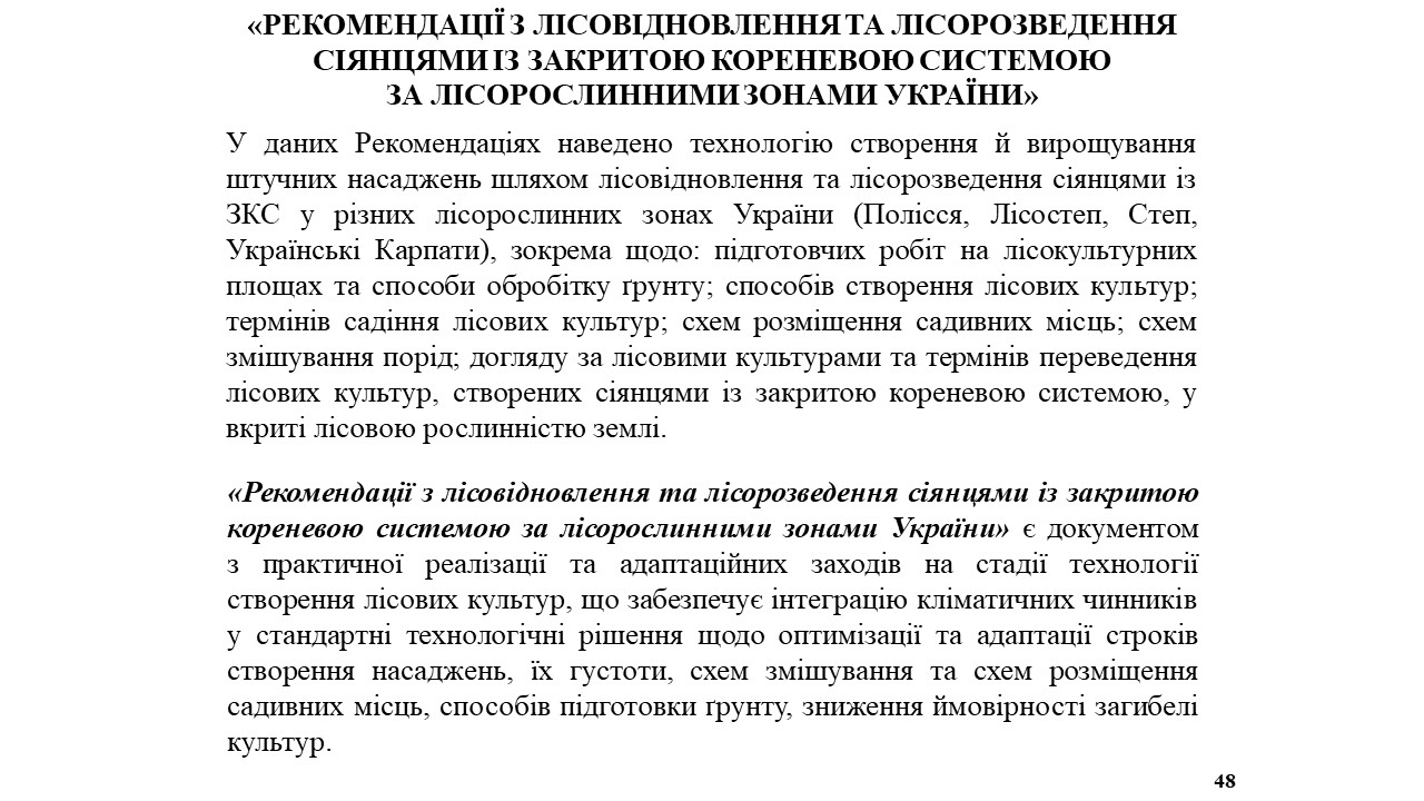Лісовідновлення в умовах зміни клімату вимагає переходу від монокультур до створення стійких, мішаних і різновікових лісів. Під час лекції було розглянуто питання чинної нормативно-правової бази щодо лісовідновлення та лісорозведення; висвітлено обсяги й особливості відтворення лісів підприємствами й установами, підпорядкованими Державному агентству лісових ресурсів України. Окрему увагу було приділено адаптаційним заходам із мінімізації наслідків впливу зміни клімату на процес відтворення лісів і доцільності збільшення обсягів вирощування високоякісного садивного матеріалу основних лісотвірних видів, у тому числі із закритою кореневою системою, як основи створення біологічно стійких, високопродуктивних і адаптованих до наслідків зміни клімату лісових насаджень різного цільового призначення.