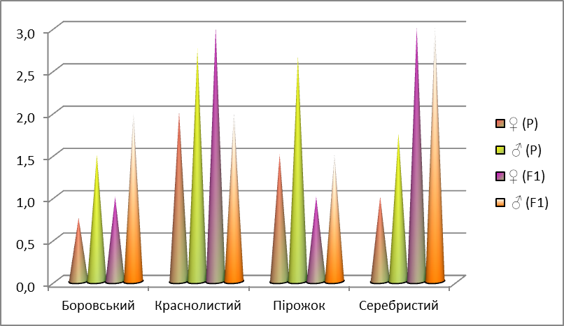 Порівняння показників інтенсивності цвітіння сортів фундука (Р) та їхніх потомств (F1)