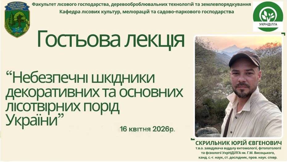 У Державному біотехнологічному університеті на кафедрі лісових культур, меліорацій та садово-паркового господарства 16 квітня відбулася гостьова лекція «Небезпечні шкідники декоративних та основних лісотвірних порід України». Доповідачем виступив в.о. завідувача відділу ентомології, фітопатології та фізіології УкрНДІЛГА, кандидат с.-г. наук, старший дослідник Юрій Скрильник. Лекцію було організовано для здобувачів вищої освіти спеціальностей «Лісове господарство» та «Садово-паркове господарство», а також викладачів факультету лісового господарства, деревооброблювальних технологій та землевпорядкування.