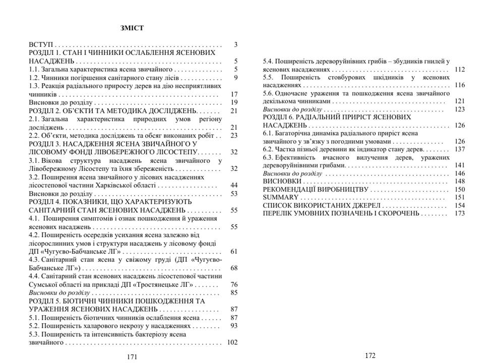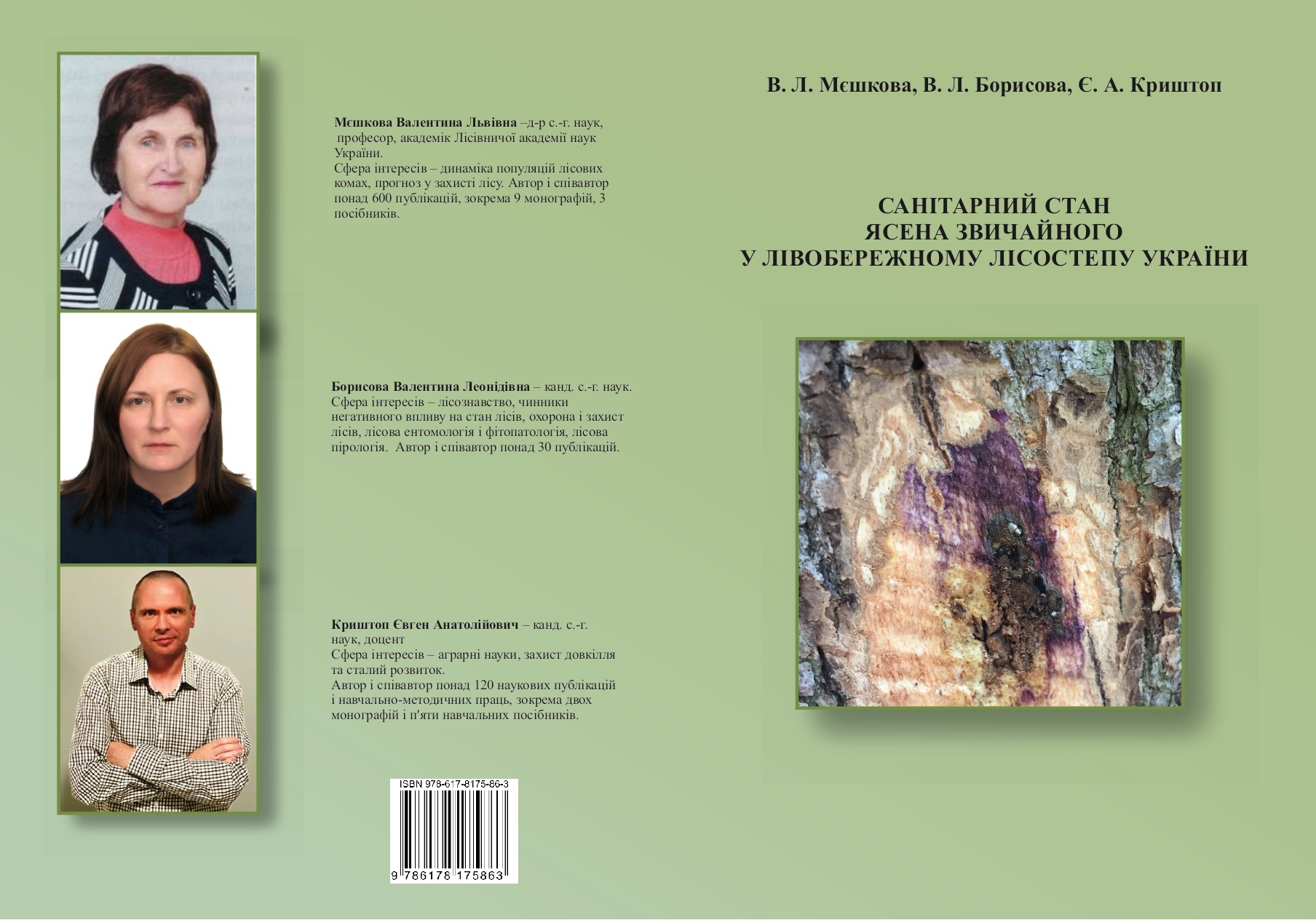 У колективній монографії «Санітарний стан ясена звичайного у Лівобережному Лісостепу України», авторами якої є фахівці з лісової ентомології й фітопатології Валентина Мєшкова і Валентина Борисова, а також еколог Євген Криштоп, визначено особливості структури лісового фонду насаджень із участю ясена звичайного в Лівобережному Лісостепу України. Виявлено тенденцію погіршення санітарного стану ясенових лісів у міру збільшення їхніх віку, повноти, частки виду в складі. Визначено основні біотичні чинники ослаблення цих насаджень (бактеріоз, халаровий некроз, стовбурові й окоренкові гнилі, стовбурові шкідники та шкідники листя), а також симптоми й ознаки їхнього прояву та особливості поширення. Встановлено переважання гнилей у ясенових лісах лісостепової частини Харківської області та халарового некрозу – в Сумській. Виявлено зв’язки зміни кліматичних умов зі станом і приростом цього виду. Обґрунтовано методики оцінювання санітарного стану ясенових насаджень.
