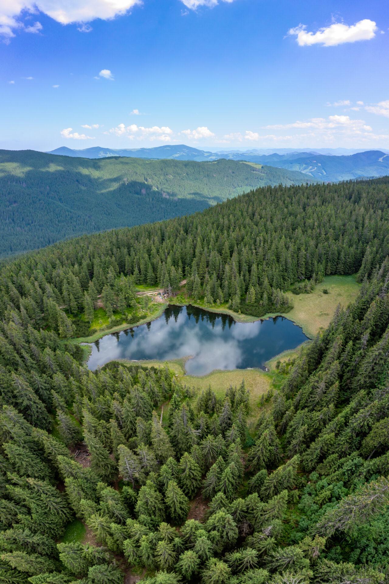 Карпатський національний природний парк. Вухатий камінь (1864 м) та озеро льодовикового походження Марічейка в підніжжі гори Шурин (1772 м), Івано-Франківська область