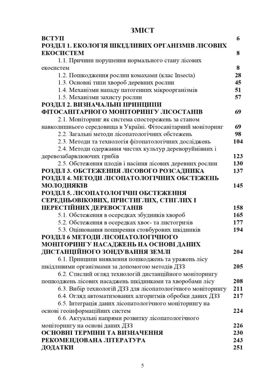 У посібнику розглянуто екологію організмів, шкідливих для лісових екосистем, а також причини порушення стану лісів; висвітлено принципи проведення лісопатологічного моніторингу як невід’ємної складової лісозахисту, зокрема: обстеження розсадників і насаджень різного віку, методи лісопатологічного моніторингу насаджень на основі даних дистанційного зондування Землі. Заслуговує на увагу й комплексність подання матеріалу, наявність додатків та значного обсягу ілюстрацій, що є необхідним для студентів, аспірантів, науковців і практиків лісового господарства.
