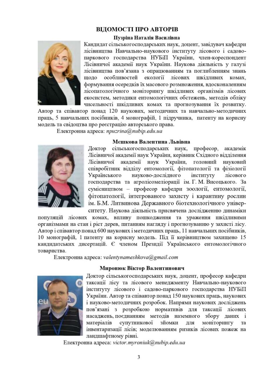 Успішний захист насаджень від збудників хвороб і шкідливих комах можливий лише за умови точної й своєчасної ідентифікації цих організмів. З цією метою авторським колективом НУБІП і УкрНДІЛГА (професором В.Л. Мєшковою) підготовлено вже друге видання навчального посібника «Моніторинг шкідливих організмів лісових екосистем».