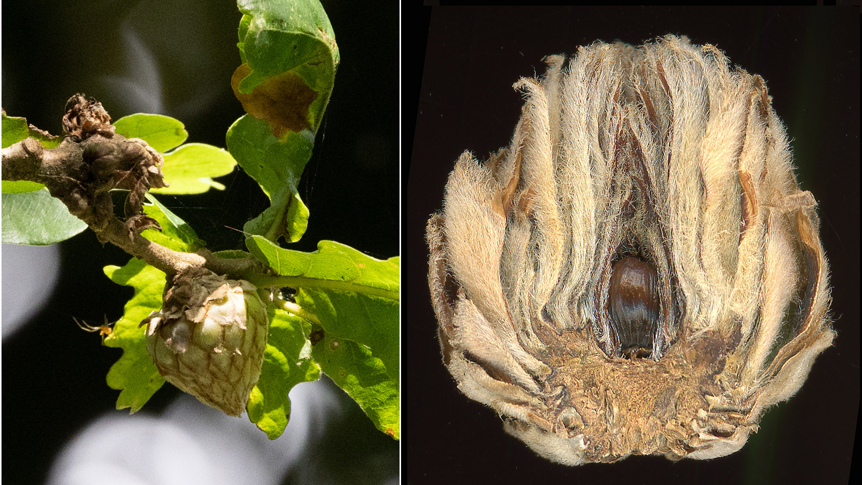 Всередині волохатого шишкоподібного гала знаходиться недорозвинений жолудь із личинкою горіхотворки