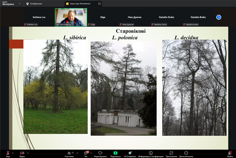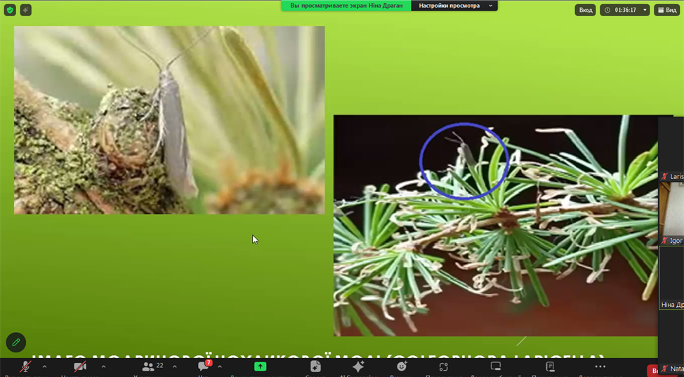 Про поширеність і шкодочинність модринової чохликової молі (Coleophora laricella (Hübner, 1817) та регуляцію її чисельності в насадженнях дендропарку «Олександрія» доповідала Ніна Драган. Зазначено, що причиною виникнення осередку шкідника могло бути розташування дерев на першій надзаплавній річковій терасі. Рекомендовано у випадку дефоліації крон понад 10–15% у модринових насадженнях застосовувати відповідні пестициди. Цікаву доповідь щодо складу та сучасного стану колекції роду Larix L., проблем збереження в дендропарку «Олександрія» презентував Ігор Мордатенко.