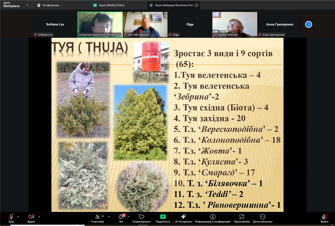 Доповідь Валентини Бабарики, присвячена складу колекції голонасінних рослин у колекції дендрофлори Криворудського дендропарку, заснованого у 1962 році в селі Крива Руда Семенівського району Полтавської області, була захопливою й інформаційно насиченою.