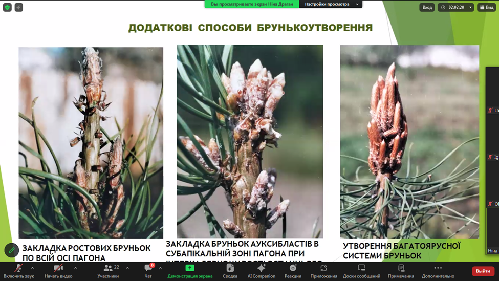 Науковці УкрНДІЛГА та дослідної мережі Інституту представили результати своїх досліджень, які стосувалися Pseudotsuga menziesii в ботанічному саду «Поділля» Вінницького національного аграрного університету (Плотнікова О. М., Лось С. А., Нейко І. С., Познякова С. І.), результатів випробування рослин роду Pinus L. в умовах дендрологічного парку ім. Б.Ф. Остапенка, м. Харків (Терещенко Л. І., Лось С. А, Григорьєва В. Г.), особливостей росту та розвитку модрини гібридної в лісових культурах на Харківщині (Григорьєва В. Г., Лось С. А., Плотнікова О. М.).