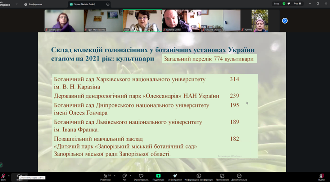 Наталія Дойко доповіла на тему «Колекція голонасінних у Державному дендрологічному парку «Олександрія» НАН України. Етапи створення та сучасний стан», в якій відмітила, що понад 230 років парк, площа якого становить більше 400 га, зберігає свою початкову структуру. Видовий склад дерев, кущів і трав'янистих багаторічників включає 2240 таксонів, а деякі хвойні екземпляри з колекції мають вік понад 200 років.