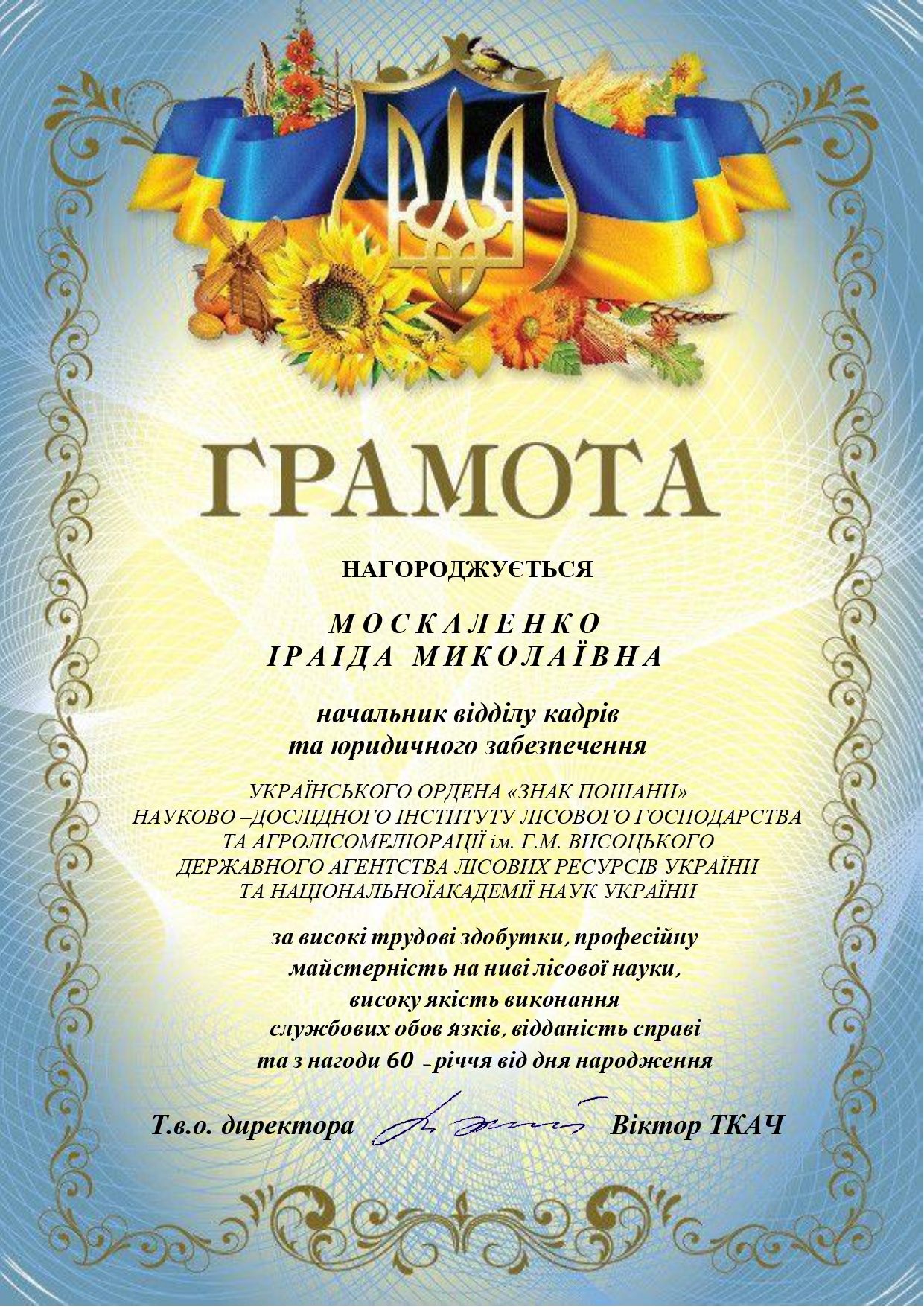 Колектив Інституту щиро вітає з 60-ти річчям Іраіду Миколаївну Москаленко, начальника відділу кадрів та юридичного забезпечення УкрНДІЛГА!