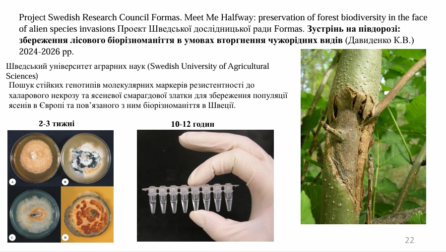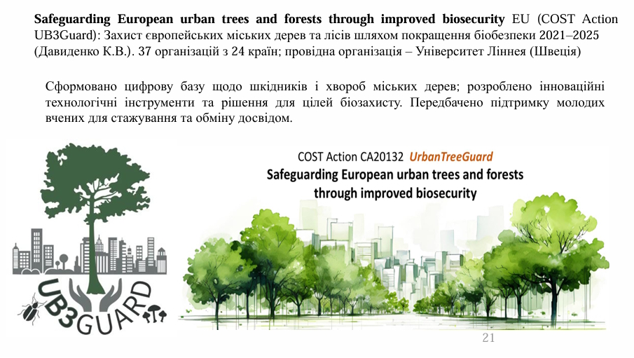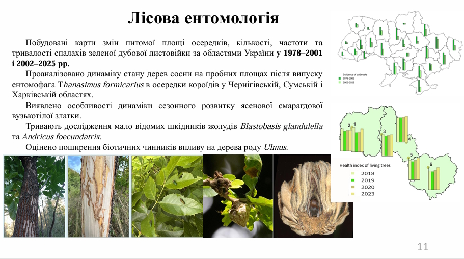 Побудовано карти змін питомої площі осередків, кількості, частоти й тривалості спалахів зеленої дубової листовійки за областями України у 1978–2001 і 2002–2025 рр. Проаналізовано динаміку стану дерев сосни на пробних площах після випуску ентомофага Thanasimus formicarius в осередки короїдів у Чернігівській, Сумській і Харківській областях. Виявлено особливості динаміки сезонного розвитку ясенової смарагдової вузькотілої златки. Тривають дослідження маловідомих шкідників жолудів Blastobasis glandulella та Andricus foecundatrix.