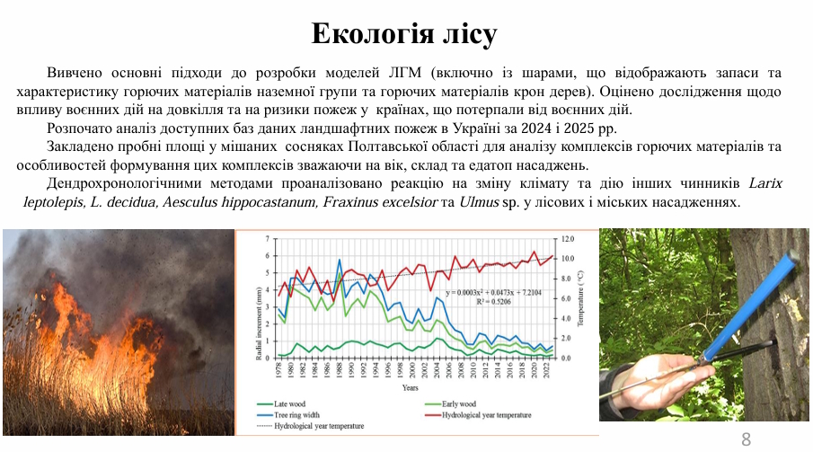 Згідно з вищенаведеним було поглиблено дослідження за основними напрямами. Так, науковцями Східного відділення ЛАН України досліджено вплив різних видів і способів рубок на лісівничо-таксаційні показники, стан, товарно-сортиментну структуру насаджень і на процеси природного відновлення лісових видів. Проведено аналіз баз даних ландшафтних пожеж в Україні за 2024 і 2025 рр., зокрема особливостей формування комплексів горючих матеріалів. Дендрохронологічними методами проаналізовано реакцію деревних видів на зміну клімату та дію інших чинників у лісових і міських насадженнях. Оцінено інтенсивність репродукції клонів сосни звичайної, дуба звичайного, ялини європейської, псевдотсуги Мензіса; стан та інвазійну активність модрини гібридної, лип широколистої, маньчжурської й дрібнолистої та ліщини деревоподібної. Оцінено стан лісових культур дуба звичайного, сосни звичайної, модрини європейської, псевдотсуги Мензіса (дугласії) та ялиці білої, створених сіянцями із закритою кореневою системою. Розроблено рекомендації щодо створення та подальшого формування стійких і продуктивних лісів.