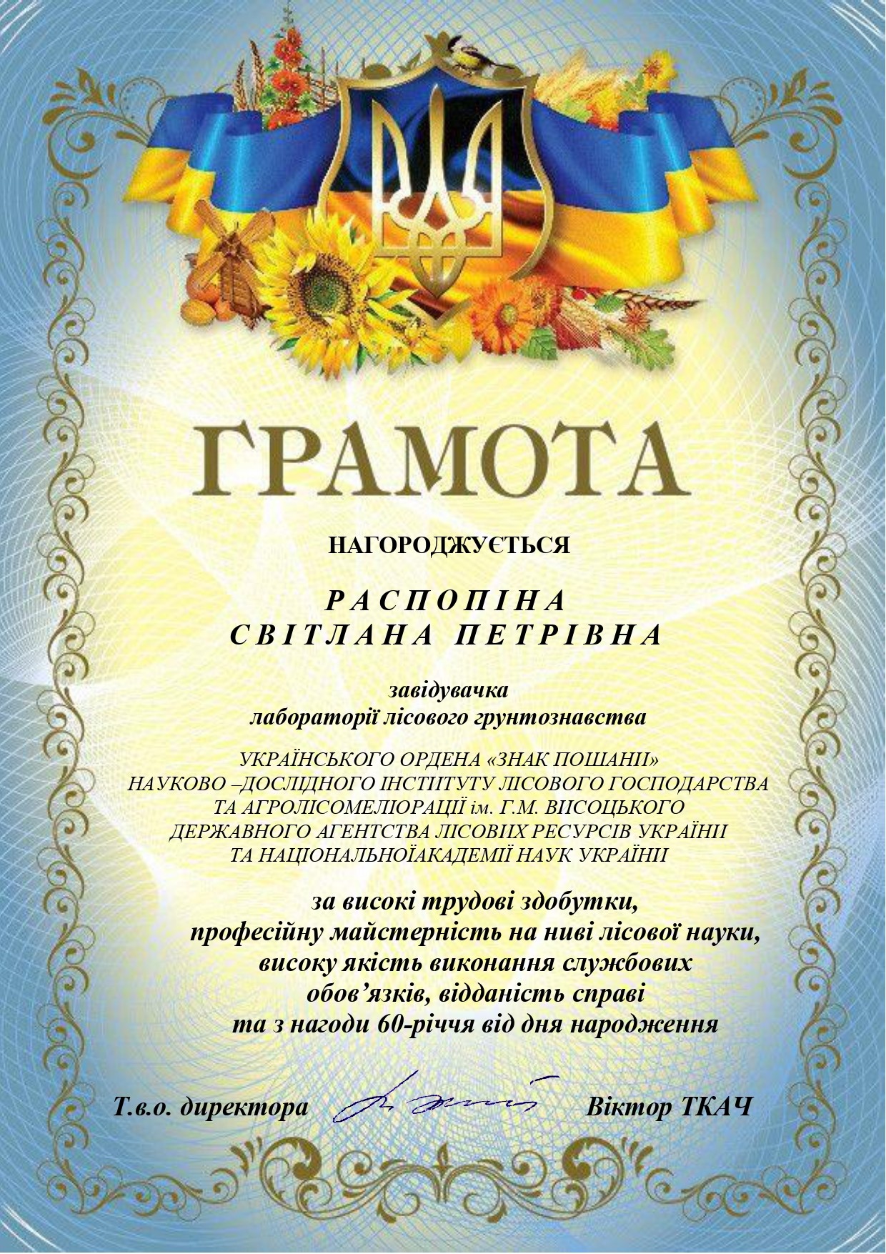 Колектив Інституту щиро вітає з 60-річчям завідувачку лабораторії лісового ґрунтознавства Світлану Петрівну Распопіну!
