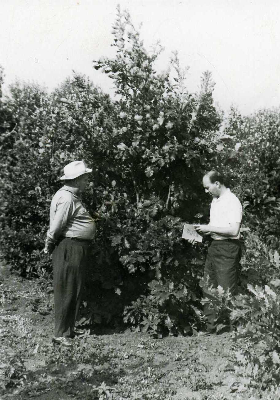П.П. Бадалов проводить екскурсію в парку «Веселі Боковеньки» та демонструє плоди найкращих форм горіхів своїй колезі Т.В. Орловській