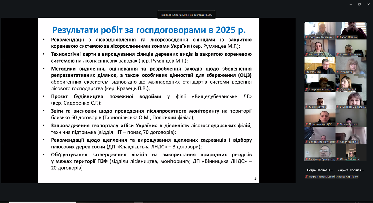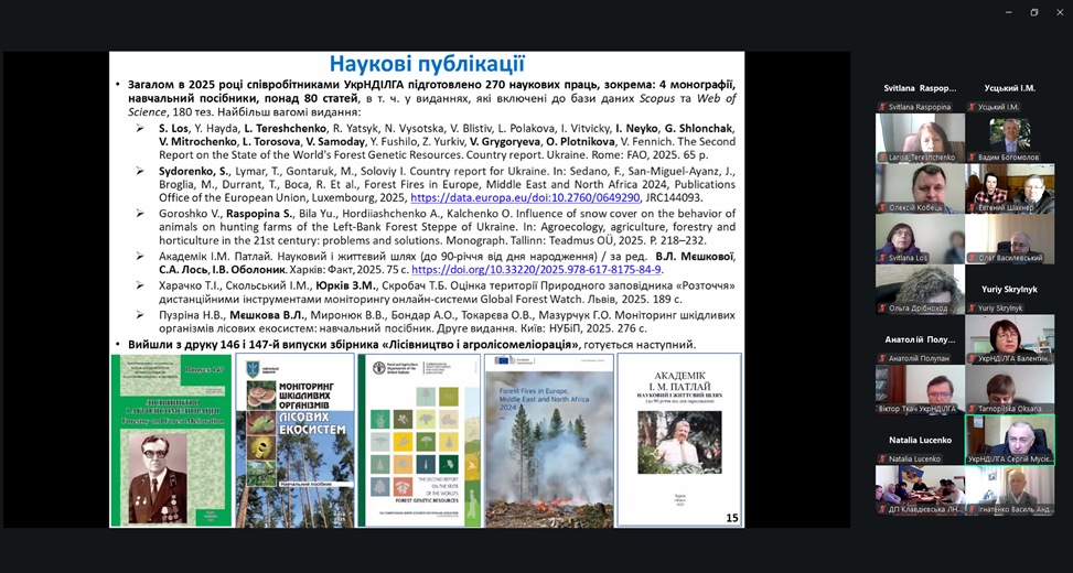 Доповідь першого заступника директора Сергія Мусієнка включала підсумки наукової діяльності установи за 2025 рік. Він відзначив, що в звітному періоді увага науковців була зосереджена на проведенні системних наукових досліджень за напрямами лісівництва та лісознавства, сталого управління лісовими ресурсами, лісовідновлення та лісорозведення, моніторингу лісів і підвищення їхньої стійкості до екологічних загроз тощо. Впродовж року було розроблено близько 30 документів за основною тематикою та поза темпланом. Також співробітниками Інституту й науково-дослідної мережі було надано науково-консультаційні послуги за понад 150 договорами, підготовлено 270 наукових праць, серед понад 80 статей, в т. ч. у виданнях, які включені до бази даних Scopus та Web of Science; вийшли з друку чергові, 146 і 147-й, випуски фахового збірника «Лісівництво і агролісомеліорація».