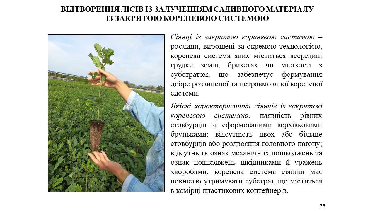 Лісовідновлення в умовах зміни клімату вимагає переходу від монокультур до створення стійких, мішаних і різновікових лісів. Під час лекції було розглянуто питання чинної нормативно-правової бази щодо лісовідновлення та лісорозведення; висвітлено обсяги й особливості відтворення лісів підприємствами й установами, підпорядкованими Державному агентству лісових ресурсів України. Окрему увагу було приділено адаптаційним заходам із мінімізації наслідків впливу зміни клімату на процес відтворення лісів і доцільності збільшення обсягів вирощування високоякісного садивного матеріалу основних лісотвірних видів, у тому числі із закритою кореневою системою, як основи створення біологічно стійких, високопродуктивних і адаптованих до наслідків зміни клімату лісових насаджень різного цільового призначення.