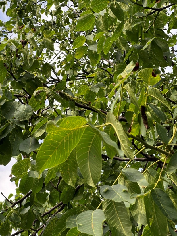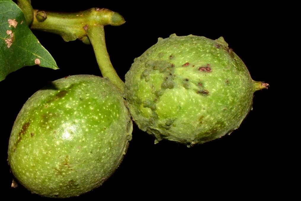Пошкодження листків і плодів волоського горіха бородавчастим кліщем (Aceria tristriata) (фото Р. Мішустіна; м. Херсон, 2013 р.).