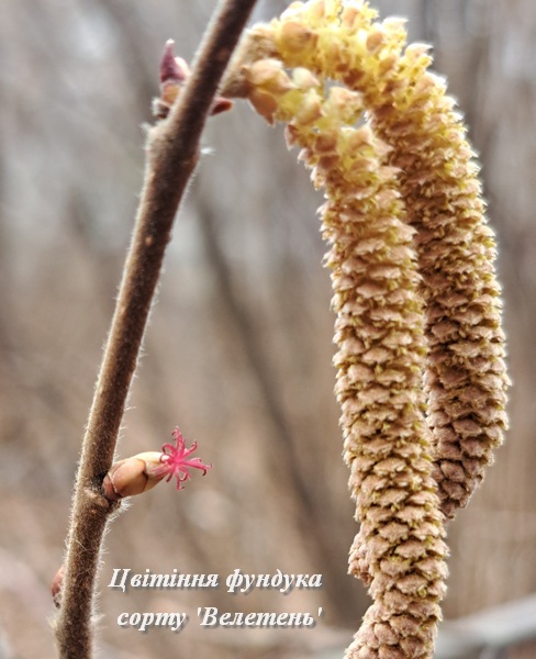 Цвітіння фундука (Corylus maxima) на території дендропарку Державного біотехнологічного університету (ДБТУ)